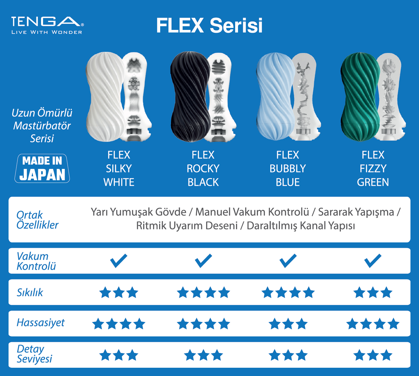 FLEX Serisi uzun süre kullanılabilmek üzere tasarlanmıştır. TENGA tarafından özel olarak geliştirilmiş yarı yumuşak gövdeye spiral formu verilmiştir. Bu tasarım sayesinde boylamasına dönen ızgaramsı bir yapı yaratılmıştır ve kullanım esnasında bu yapı dönerek kayma hissi yaratır. Üstelik sert olmadığından dolayı rahatlıkla sıkılabilir, bükülebilir, çevrilebilir ve böylelikle içerideki alanın darlığı ayarlanabilir. FLEX Silky White modelinde yumuşak ve sarmalayıcı bir uyarım sağlanırken, FLEX Rocky Black modelinde sıkı ve yoğun bir uyarım sağlanır.