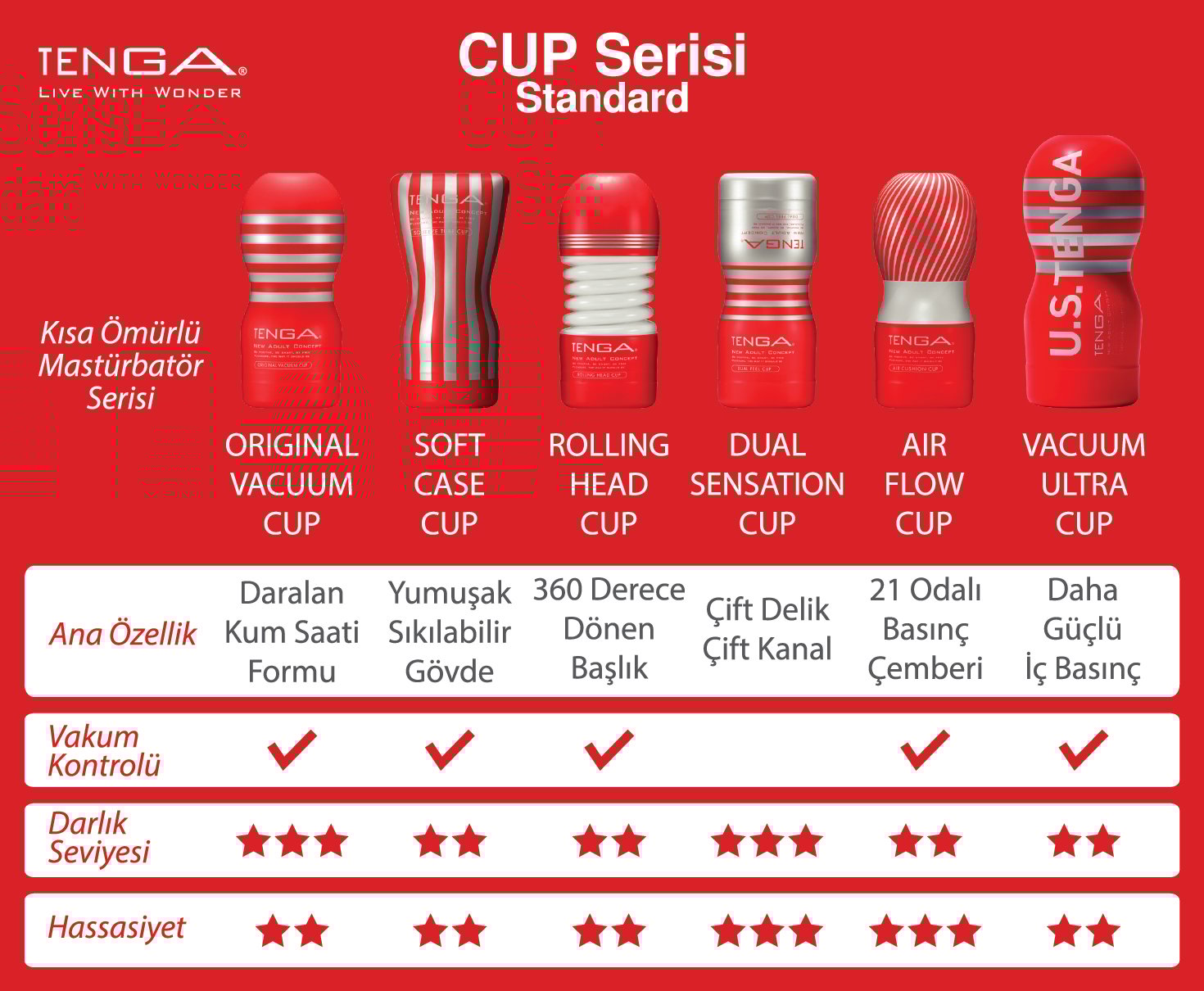CUP Serisine dahil modeller, uzun ömürlü olmadığından dolayı, eğer rahatlıkla yıkayabileceğiniz, uzun süre kullanımlık bir TENGA istiyorsanız, AIR-TECH, 3D, FLEX, AERO, GEO, CRYSTA, FLIP, SPINNER, BOBBLE gibi devamlı kullanıma uygun, dayanıklı serilerimizi incelemenizi tavsiye ederiz.